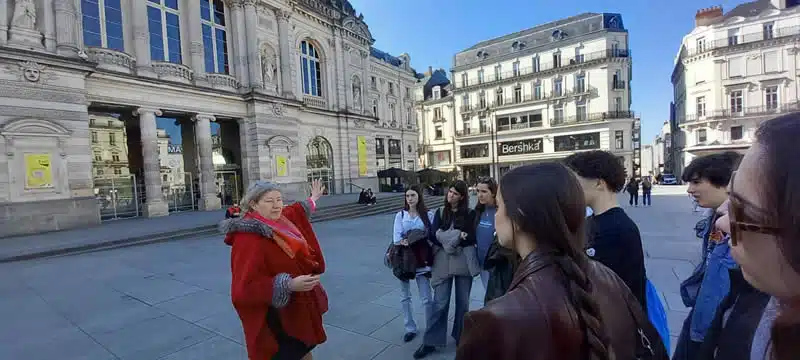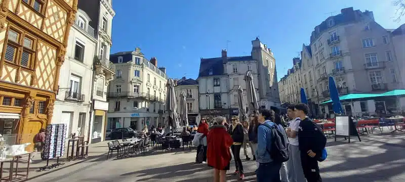 Hoy se han levantado temprano para ir a clase. Durante la mañana han estado en clase con sus correspondientes. Después de comer, han hecho una visita guiada a la ciudad donde les han explicado las cosas más importantes de Angers como el castillo, el teatro, la plaza, la galería… Y por último han vuelto a casa cada uno con sus correspondientes.